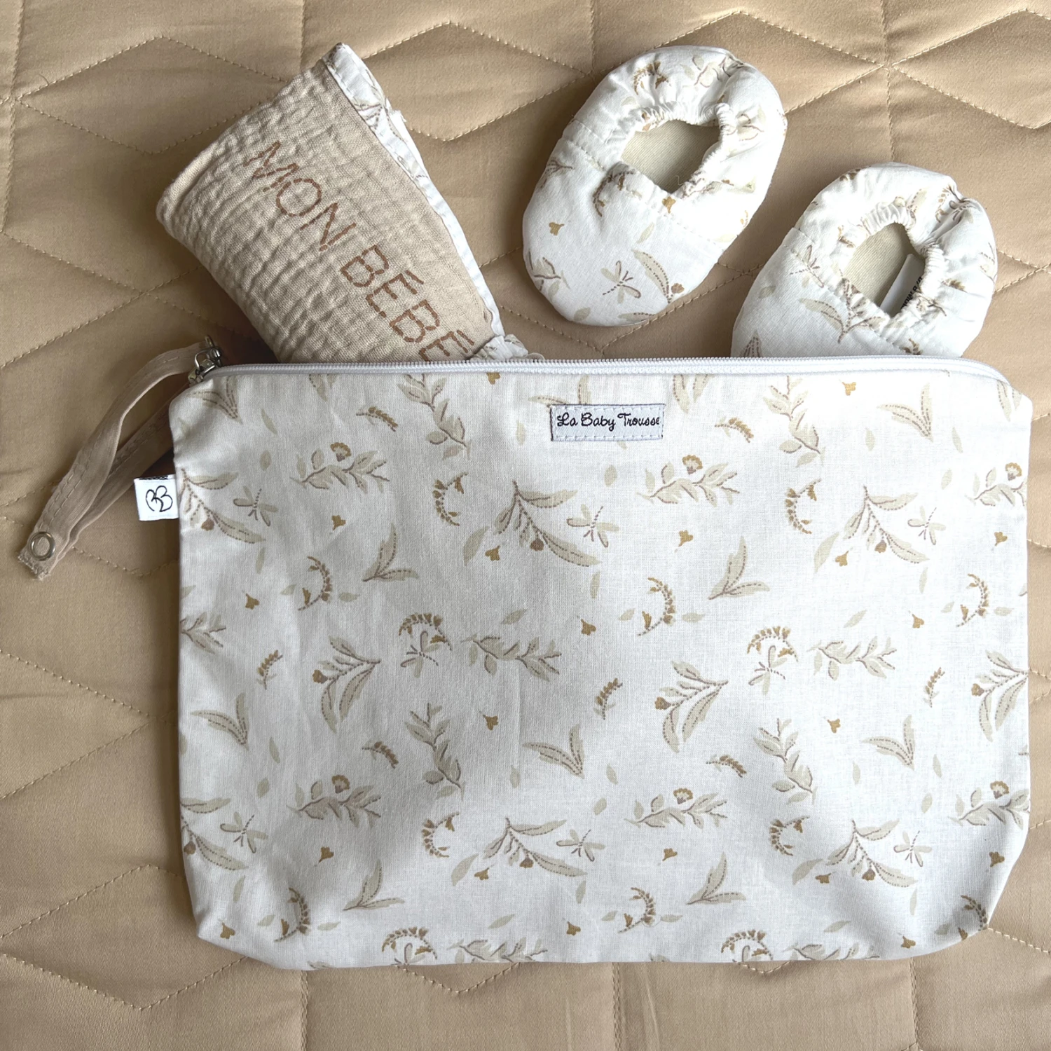 C’est LA solution que les mamans attendaient pour les petites balades avec bébé et à chaque fois que l’encombrant sac à langer ne s’avère pas nécessaire. Jolie et pratique, elle permet d’emporter quelques couches, un paquet de lingettes, un doudou ou un petit rechange par exemple. Avec son lien pressionné, la Baby trousse peut s’accrocher à la poussette ou bien se glisser dans le sac à main. Le kit essentiel de bébé en balade… enfin glamour ! En popeline de coton avec intérieur doublé coton.