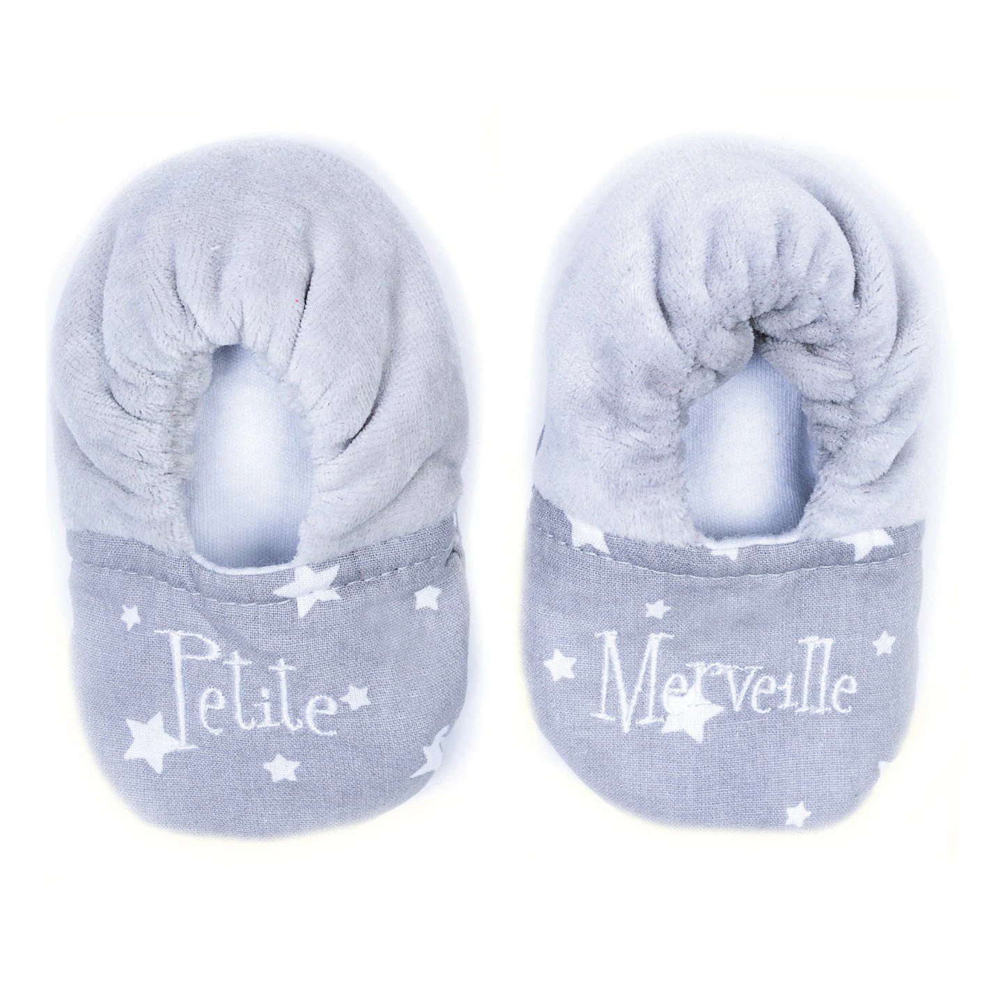 En popeline de coton et en velours rasé, les chaussons BB&Co gardent les pieds de bébé bien au chaud tout en apportant la touche finale à sa tenue ! Ils sont élastiqués à l’arrière pour un bon maintien au pied et tous doublés en 100% coton pour un confort inégalé. Broderie Petite Merveille sur le dessus du pied. Taille unique 0-6 mois.