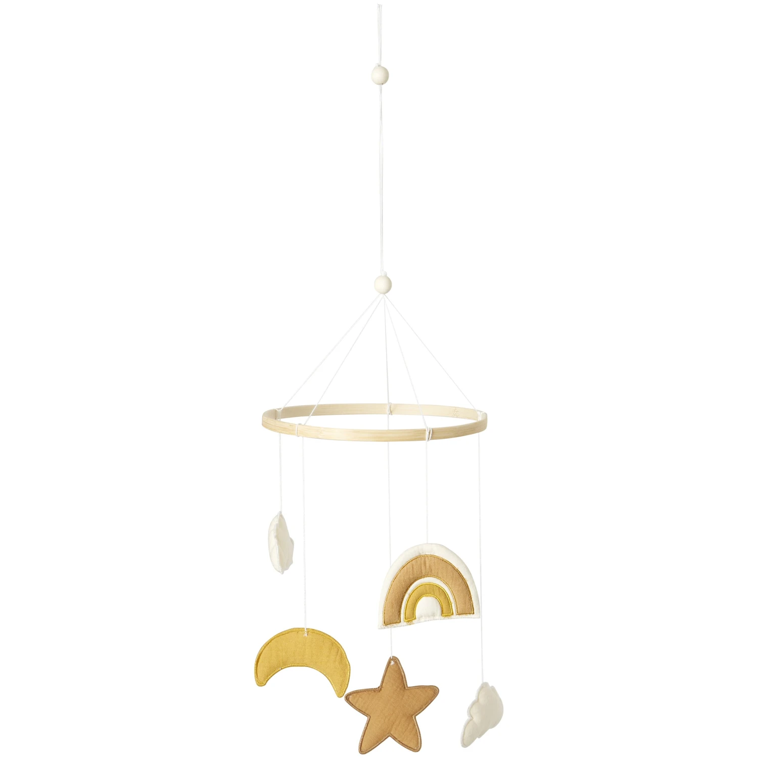 Ajoutez une touche de poésie à la chambre de bébé avec cet adorable mobile décoratif inspiré par l’arc-en-ciel. Mobile à suspendre composé d’un cercle en bois de 20 cm de diamètre sur lequel sont fixés cinq éléments décoratifs en gaze de coton. Hauteur : environ 45 cm.