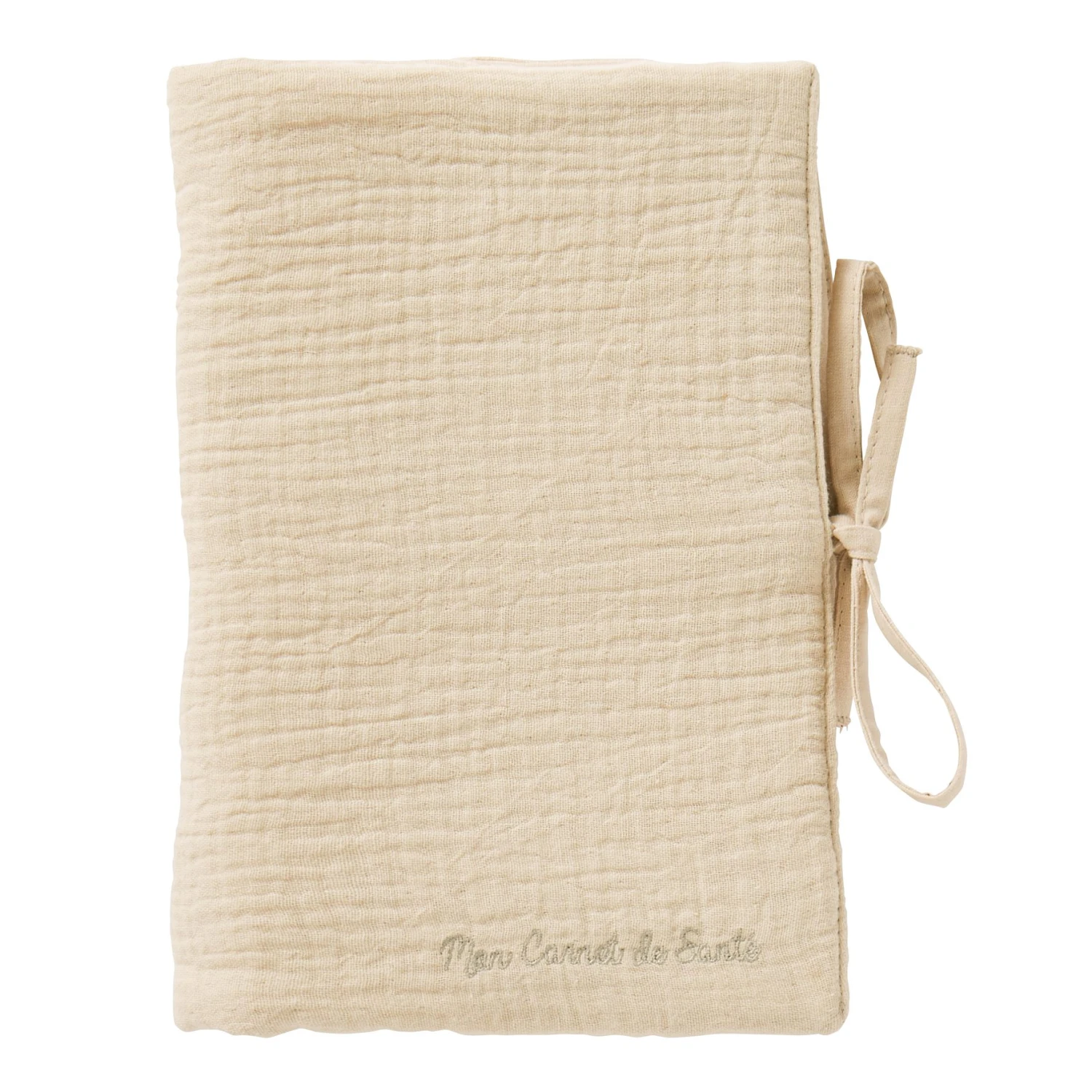 Un protège carnet de santé joli et pratique en double gaze pur coton, légèrement rembourré. Rabats à l’intérieur et liens à nouer sur le côté. Broderie Mon carnet de santé sur le devant.