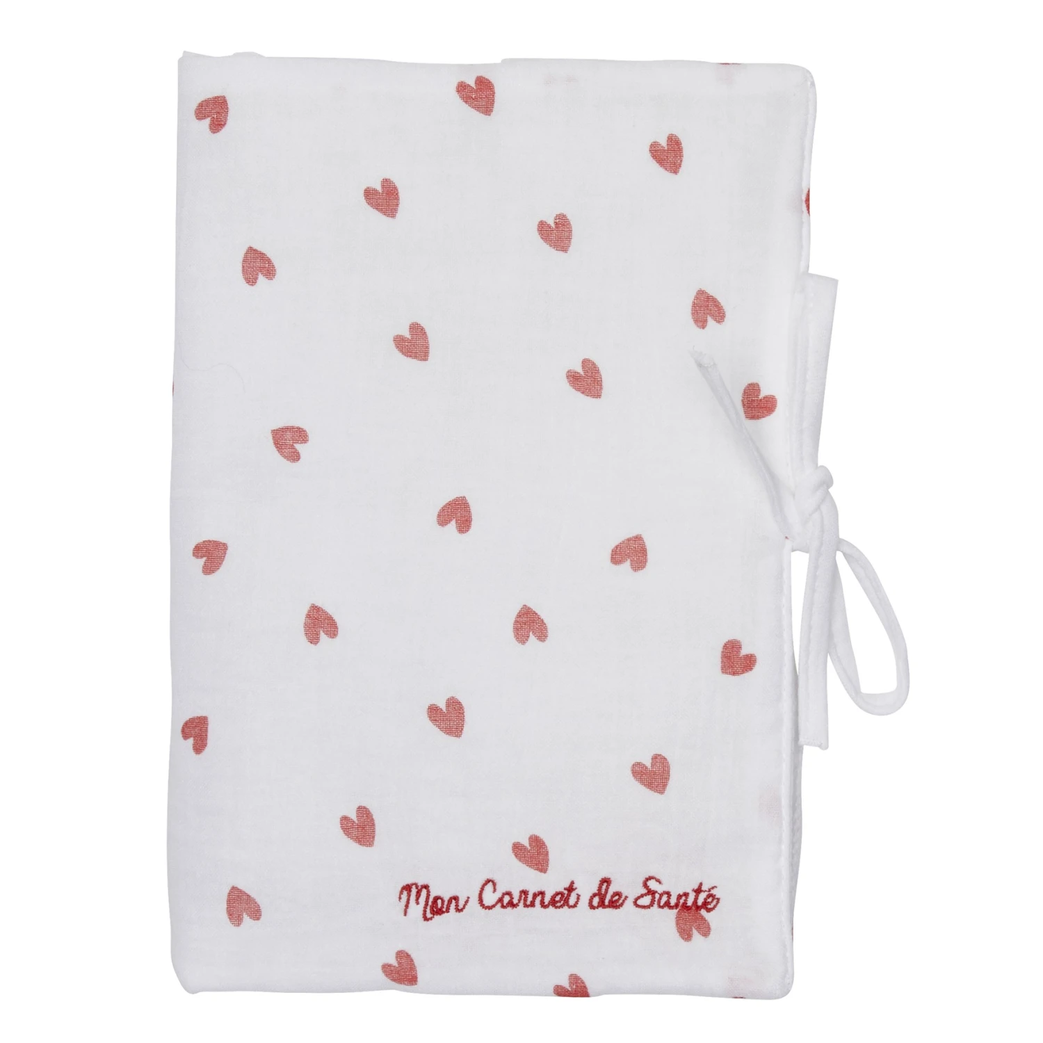 Un protège carnet de santé joli et pratique en gaze de coton imprimé, légèrement rembourré. Rabats à l’intérieur et liens à nouer sur le côté. Broderie Mon carnet de santé sur le devant.